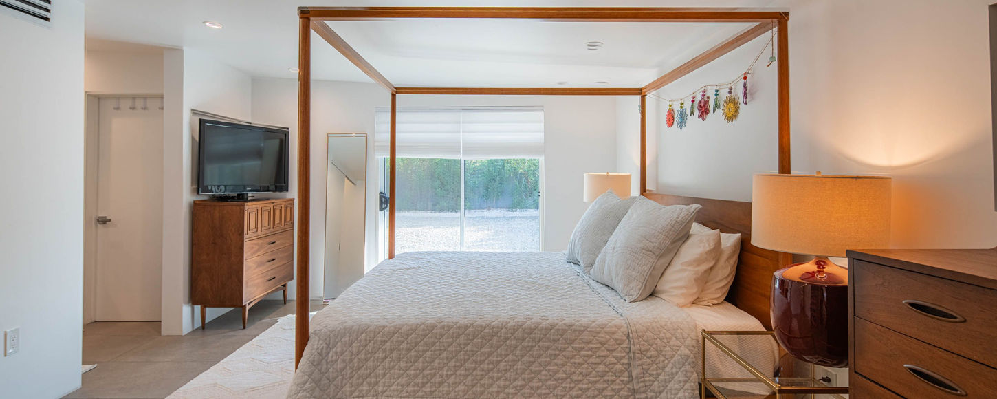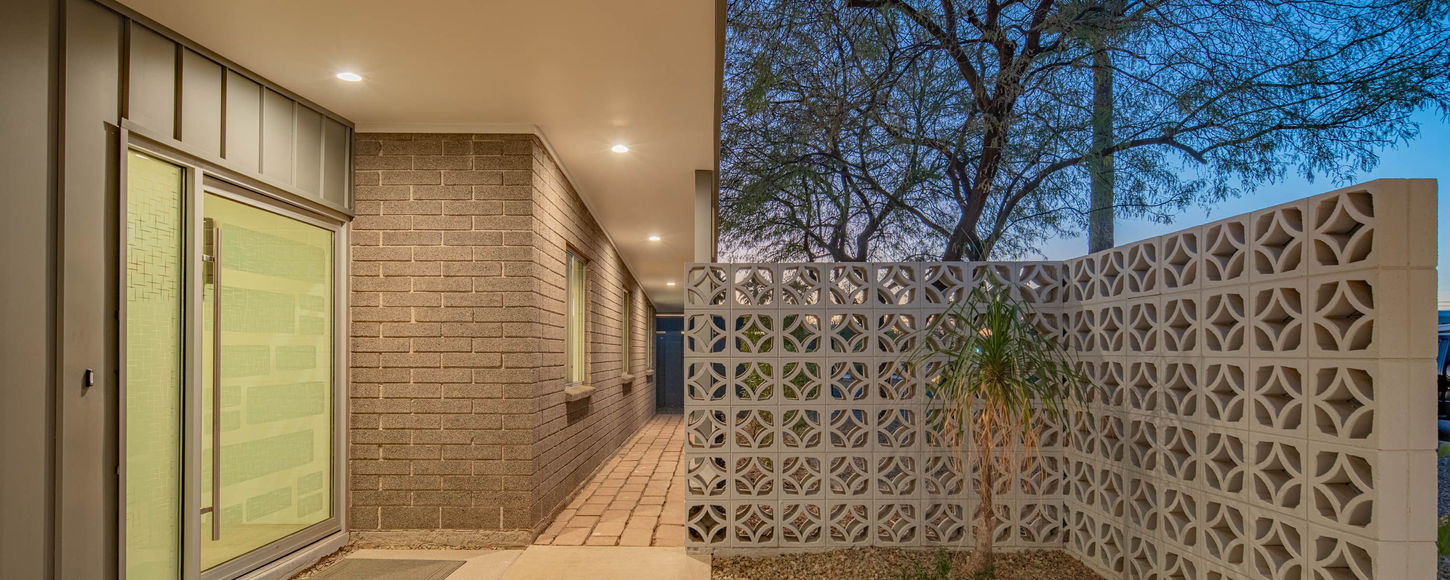 MID CENTURY MODERN: The house and addition are both of masonry construction showcasing a high level of craftsmanship and sandblasted to a vibrant finish. Generous overhangs, and the original bedroom screens are key design elements and also function to provide privacy. The thoughtful improvements augment and embrace the original floor plan. Welcome expanses of glass doors connect the interior of the home seamlessly to the outdoors, while long overhangs protect from the elements in the required seasons, appropriate to modernism and passive energy efficiency. The Owner’s Suite is particularly generous, with a large walk-in closet, walnut vanity desk and rare front to back cross ventilation. Original Post War Modernism details preserved and new additions follow a “ What would Al do” approach, continues to keep this home timeless.